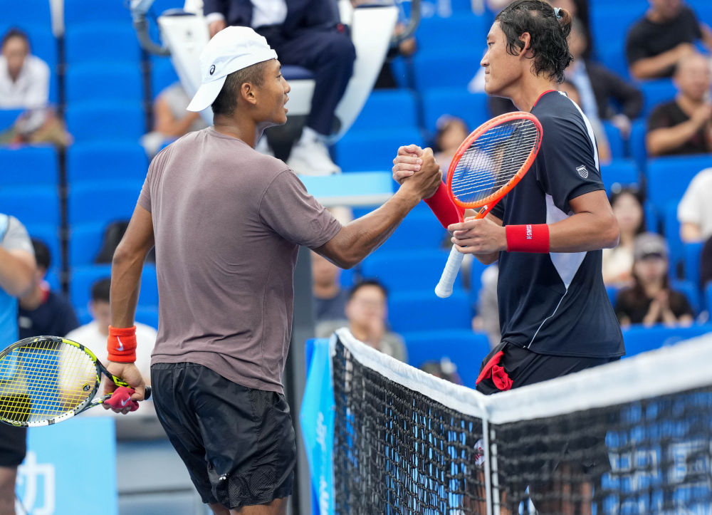 11月17日,張之臻(右)與尼敦堅贊在賽后握手致意。新華社記者 顏麟蘊 攝