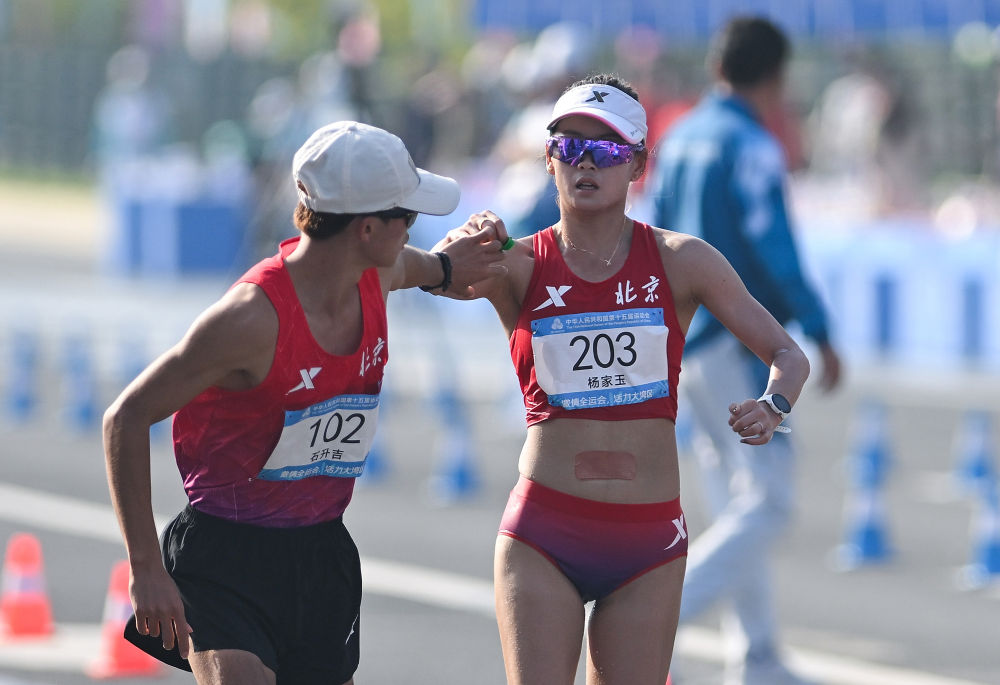 在全運會首次設立的馬拉松競走混合接力中,18歲的石升吉與29歲老將楊家玉攜手,為北京隊贏得該項目歷史首金。