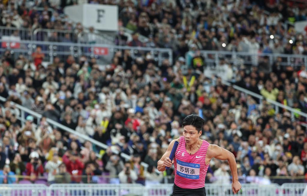 當(dāng)日,田徑項目依然是金牌大戶,共產(chǎn)生12枚金牌。36歲的男子100米亞洲紀(jì)錄保持者蘇炳添成為全場焦點,他在家門口的賽道上跑完了職業(yè)生涯的最后100米,帶領(lǐng)一眾“00后”隊友為廣東隊奪得男子4×100米接力第四名。盡管未能幫助家鄉(xiāng)隊伍站上領(lǐng)獎臺,但蘇炳添仍贏得了滿場掌聲。