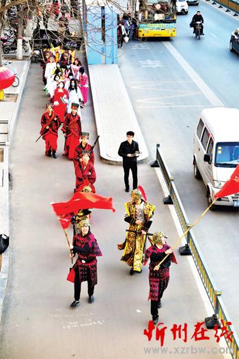 男的身披戰(zhàn)袍鎧甲,女的一襲古裝長裙,一支戰(zhàn)國時(shí)代的隊(duì)伍揮舞旗幟、佩帶長劍從忻州城區(qū)七一路走過?!笆遣皇桥碾娨晞×耍俊边^往行人紛紛側(cè)目觀望。