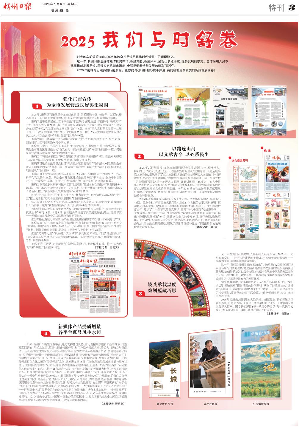 2025年,《忻州晚報》以濃厚的本土情懷和人文關懷服務讀者,全年推出48期。重點專欄“忻州歷史名鎮(zhèn)”深入講述20個古鎮(zhèn)的故事,同時新開“探訪魅力村落”欄目,定襄芳蘭、馬城等村的獨特風情躍然紙上。文化報道貫穿全年,延續(xù)了二十四節(jié)氣的圖文解讀,推動“文化中國行”走進原平同川、東社等地。在中國人民抗日戰(zhàn)爭暨世界反法西斯戰(zhàn)爭勝利80周年之際,推出“忻州抗戰(zhàn)英模譜”專欄,重溫18位老兵的崢嶸歲月,緬懷先烈,致敬英雄。此外,晚報積極回應社會關切,對中高考政策、流感防護、供暖保障等社會焦點、民生熱點及時報道,展現(xiàn)了媒體的責任與溫度,體現(xiàn)出鮮明的地域特色和時代擔當。(本報記者劉捷)