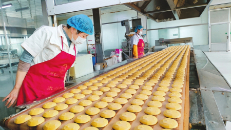 山西鑫炳記食業(yè)股份有限公司生產車間里,工作人員正在制作太谷餅。孫泰雁攝