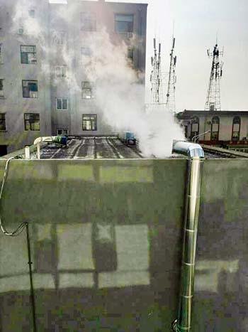 圖為城區(qū)榮鈺苑小區(qū)院內(nèi)一飯店,四個排氣煙筒發(fā)出的噪音讓小區(qū)周邊居民無法正常休息,排放出的油煙散發(fā)出嗆人的味道,住戶沒法開窗戶,希望相關(guān)部門管理。一網(wǎng)友攝