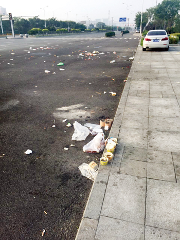 城區(qū)高鐵廣場(chǎng)前,慕山路與雁門大道丁字路口,每天晚上有小商販在此經(jīng)營(yíng),本無(wú)可厚非,但每天產(chǎn)生的垃圾,既影響市容環(huán)境,還給環(huán)衛(wèi)工人增加了工作量,呼吁市民及小商販愛護(hù)環(huán)境,也希望相關(guān)部門管理維護(hù)公共環(huán)境。一網(wǎng)友攝于8月22日