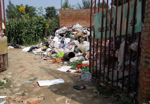 8月2日上午,在村民的陪同下來到匡村村南,在忻州烈士陵園背后一個叫周家(音)墳的地方,看到路口黑色的玉米桿躺放在井蓋上,生銹的用鋼管焊成的院門兩邊和門口,堆放著五顏六色的塑料袋以及廢塑料和破鐵桶等生活垃圾破爛,連院內(nèi)也同樣是垃圾。
