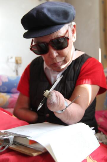 用嘴含筆寫,殘臂夾筆(抱臂)寫,鐵圈套筆寫。整整7年??喟究鄬懥?年,反復(fù)修改了7遍。2000多個日日夜夜,父親翻爛了四本字典,很多時候,胳膊翻書不方便,他就用嘴唇翻,用舌頭翻。用掉半噸稿紙,終于在1996年7月,出版了33萬字的自傳體小說《極限人生》。