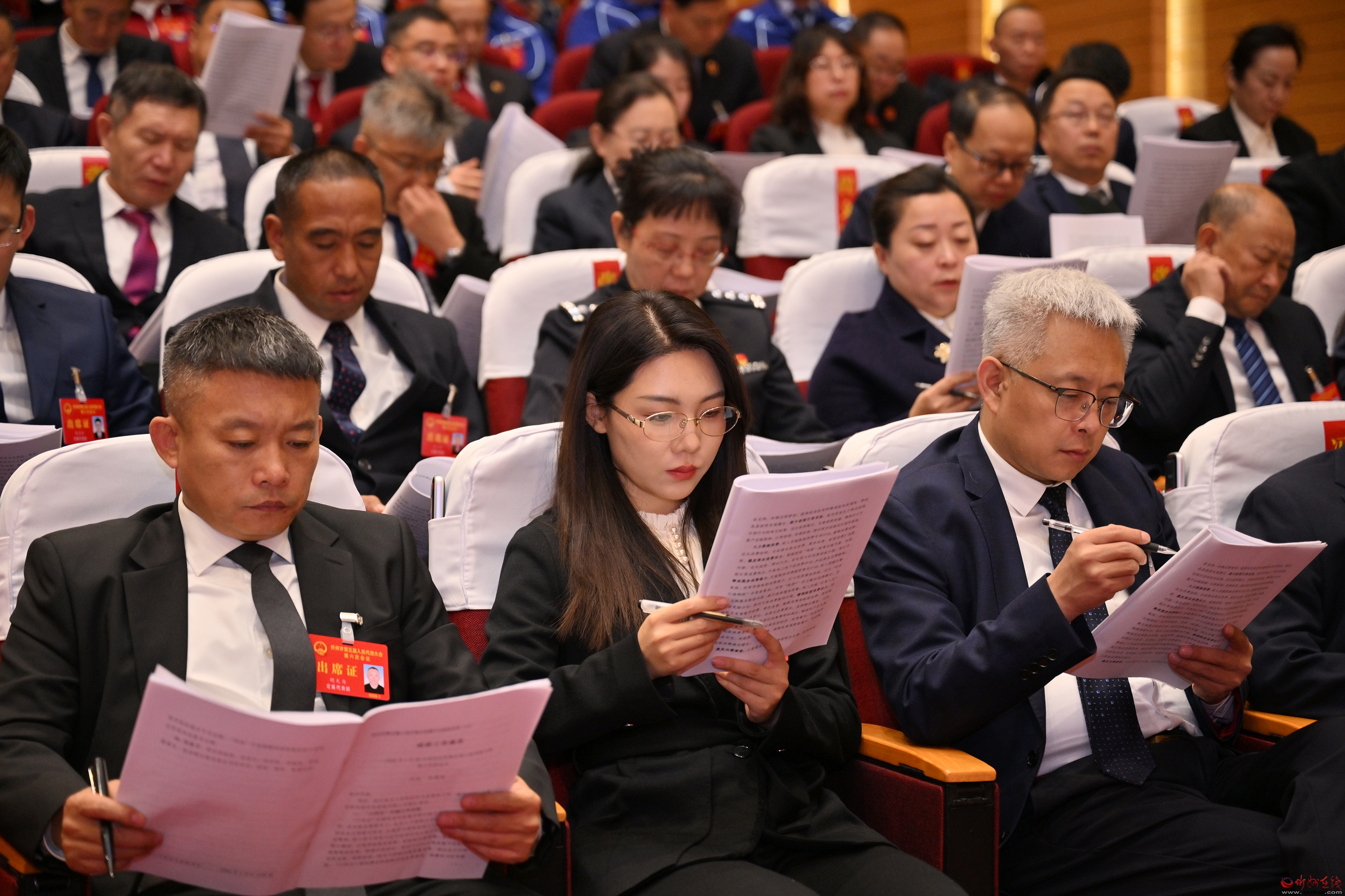 泛華會(huì)場(chǎng)內(nèi)簡樸莊嚴(yán),主席臺(tái)帷幕正中的國徽在鮮艷的紅旗映襯下熠熠生輝。會(huì)場(chǎng)二樓“更加緊密地團(tuán)結(jié)在以習(xí)近平同志為核心的黨中央周圍,奮力譜寫中國式現(xiàn)代化忻州篇章”的標(biāo)語,提振信心、催人奮進(jìn)。