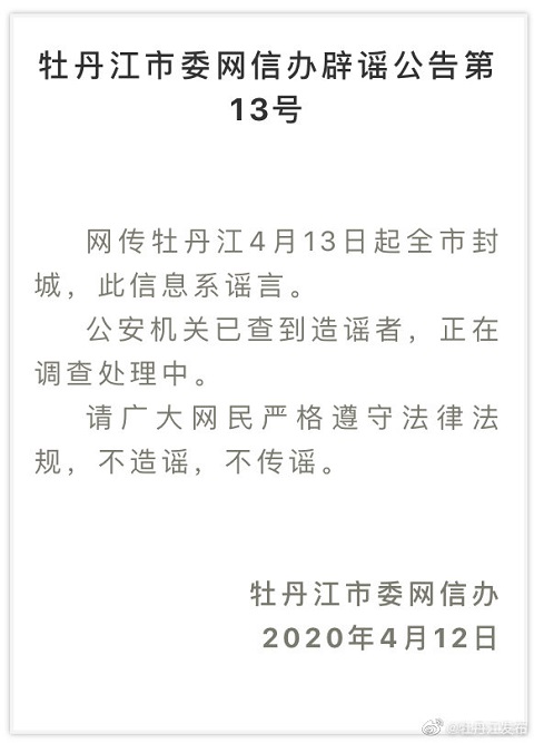 網(wǎng)傳牡丹江4月13日起全市封城,此信息系謠言。公安機關(guān)已查到造謠者,正在調(diào)查處理中。請廣大網(wǎng)民嚴(yán)格遵守法律法規(guī),不造謠,不傳謠。