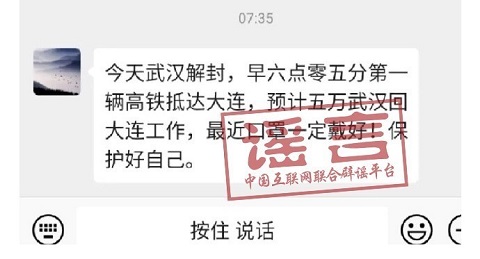 4月8日,有消息稱:“今天武漢解封,早六點(diǎn)零五分第一輛高鐵抵達(dá)大連,預(yù)計五萬武漢人回大連工作,最近口罩一定戴好……”。