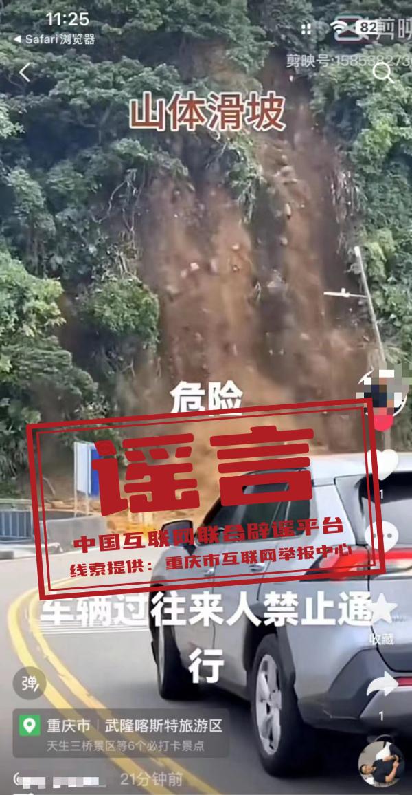 真相:近日,有網(wǎng)民發(fā)布了一則“山體滑坡危險,過往車輛行人禁止通行”的視頻,視頻定位標注為“重慶市武隆喀斯特旅游區(qū)”。經(jīng)重慶市武隆區(qū)多部門核實,該區(qū)近期未發(fā)生大面積山體滑坡事件。網(wǎng)傳視頻實為2024年6月3日臺灣省基隆市中正區(qū)潮境公園入口發(fā)生的大規(guī)模山體滑坡事件,而視頻中所標注的定位信息系網(wǎng)民發(fā)布視頻的地點,而非事件發(fā)生的地點。(來源:“重慶辟謠”微信公眾號、網(wǎng)信武隆