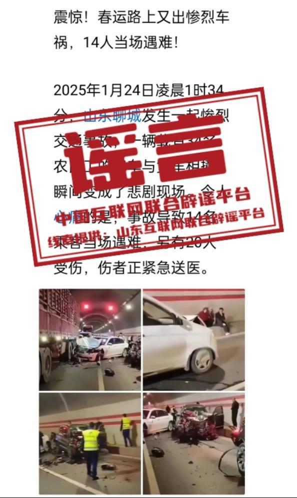 真相:近日,有網(wǎng)民在網(wǎng)絡(luò)平臺(tái)發(fā)布一則“山東聊城一隧道內(nèi)發(fā)生多車相撞”的信息,稱“現(xiàn)場(chǎng)多車發(fā)生嚴(yán)重碰撞,場(chǎng)面慘烈,群眾滯留”,引發(fā)關(guān)注。經(jīng)當(dāng)?shù)鼐胶藢?shí),山東省聊城市從未發(fā)生過類似交通事故,該信息內(nèi)容純屬虛假編造。經(jīng)查,網(wǎng)民褚某某和韓某為博取關(guān)注、吸引流量,將外省市發(fā)生交通事故的圖片視頻移花接木,稱“聊城發(fā)生交通事故”并憑空捏造傷亡人數(shù),造成不良影響。目前,二人已被公安機(jī)關(guān)依法打擊處理。(來源:山東互聯(lián)網(wǎng)聯(lián)合辟謠平臺(tái)、聊城市網(wǎng)上辟謠平臺(tái))