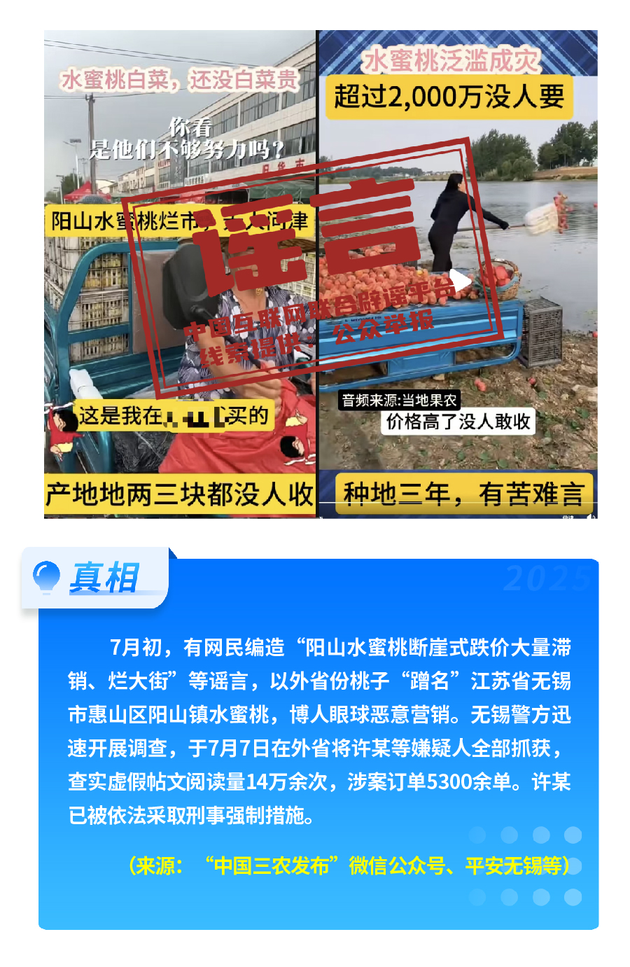 此外,7月份正值暑期旅游旺季和水果等農(nóng)產(chǎn)品收獲季,有自媒體、商家借機編造傳播涉文旅及農(nóng)產(chǎn)類謠言,干擾市場秩序,侵害消費者權(quán)益。有商家違規(guī)使用人民大會堂建筑圖片標(biāo)識和名稱,仿冒人民大會堂賬號,非法售賣、倒賣參觀門票,損害游客權(quán)益。個別商家剪輯發(fā)布“江蘇無錫陽山水蜜桃斷崖式跌價、大量滯銷、爛大街”謠言視頻,再借機兜售假冒的陽山水蜜桃,博人眼球惡意營銷,擾亂市場秩序。所謂“峨眉山人猴大戰(zhàn),游客墜崖,猴王被當(dāng)場擊斃”景區(qū)安全事件一度傳得沸沸揚揚,相關(guān)視頻以驚悚情節(jié)博取關(guān)注,畫面實際是用AI合成拼接制作。
