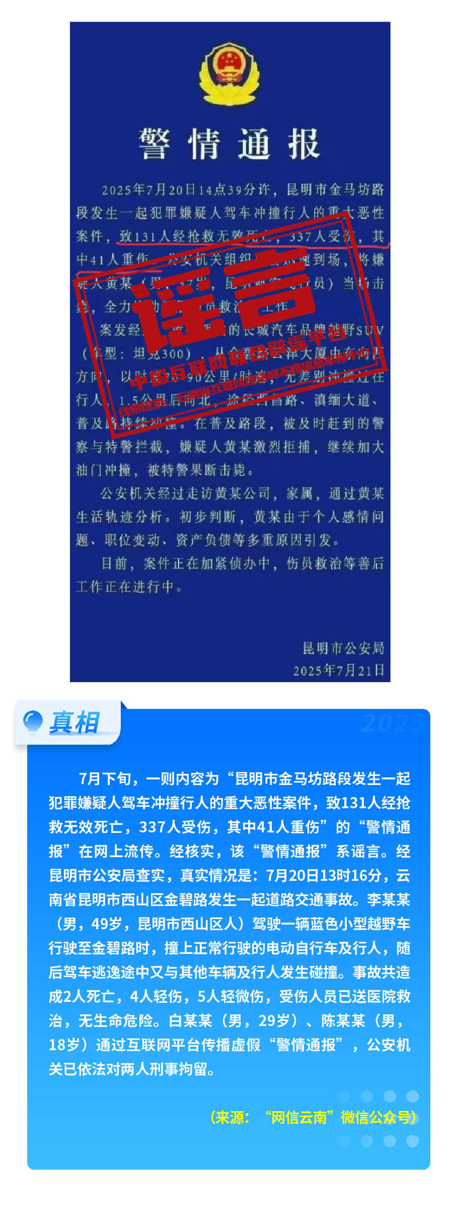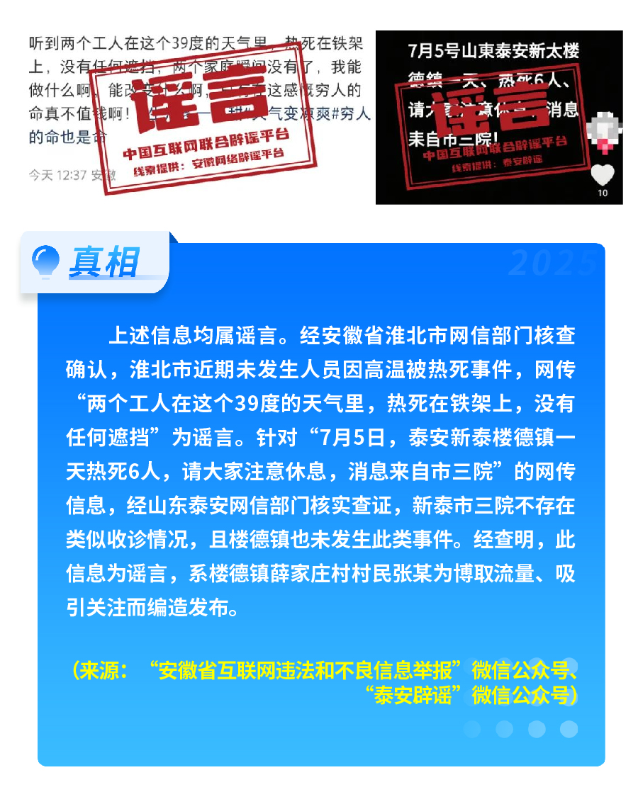 近期,網(wǎng)上接連出現(xiàn)發(fā)布虛假“警情通報”的惡性造謠傳謠案件,炮制傳播“昆明駕車撞人案131人死亡”“杭州自來水接入糞水”及涉釋永信虛假“警情通報”,模仿“藍底白字”格式,杜撰聳人聽聞細節(jié),損害政府公信力,嚴(yán)重擾亂社會秩序?!霸菏款A(yù)測廣東將發(fā)生8級以上大地震”公然偽造專家聊天截圖,謊報地震預(yù)警。還有造謠者借盛夏高溫酷暑與洪澇災(zāi)害,編造“安徽淮北、山東泰安等地多人因高溫死亡” “重慶大暴雨導(dǎo)致15人死亡、4人失蹤”等謠言,蹭炒熱點、煽動情緒。