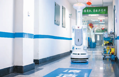 在四川德陽市人民醫(yī)院拍攝的工作中的鈦米消毒機器人。新華社發(fā)