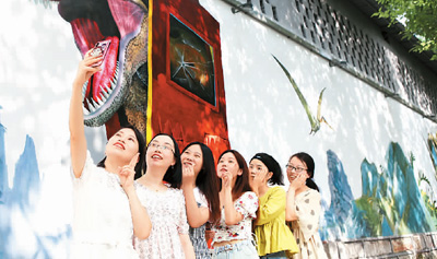 人們在“網(wǎng)紅打卡點(diǎn)”重慶永川恐龍3D藝術(shù)墻繪前留影。陳仕川攝 (人民圖片)