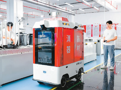 福建省福州市倉山區(qū)大力發(fā)展以智能制造為主導的新一代信息技術(shù)產(chǎn)業(yè),通過人才引進、科技創(chuàng)新、強化金融服務(wù)和落實財稅等惠企政策,積極打造數(shù)字經(jīng)濟核心產(chǎn)業(yè)集聚區(qū)。圖為技術(shù)人員在福建漢特云智能科技有限公司生產(chǎn)線上調(diào)試消防智能巡邏機器人。新華社記者 魏培全攝