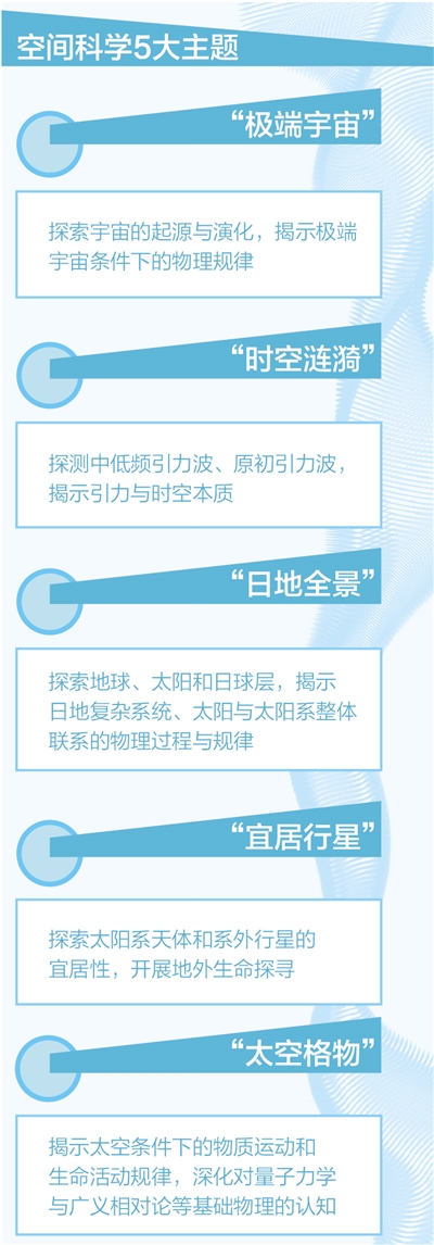 “太空格物”主題。主要是揭示太空條件下的物質(zhì)運(yùn)動(dòng)和生命活動(dòng)規(guī)律,深化對(duì)量子力學(xué)與廣義相對(duì)論等基礎(chǔ)物理的認(rèn)知。優(yōu)先發(fā)展方向包括微重力科學(xué)、量子力學(xué)與廣義相對(duì)論、空間生命科學(xué)等。