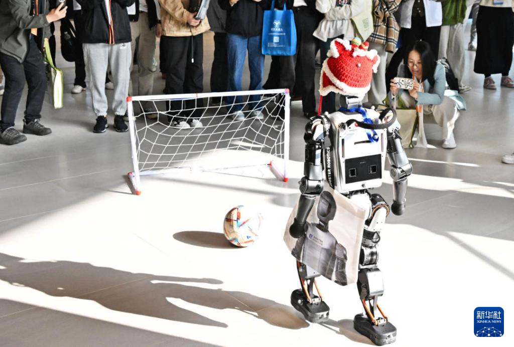在大會(huì)展覽區(qū),一款正在踢足球的具身智能機(jī)器人受到不少參觀者圍觀。當(dāng)工作人員傳球后,機(jī)器人馬上跑到足球前將球準(zhǔn)確射入球門中,射中后還不忘揮舞手臂以示慶祝。