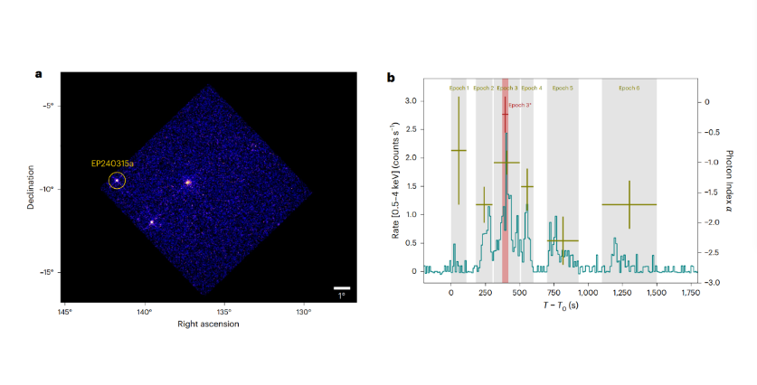 我國“天關”衛(wèi)星(愛因斯坦探針衛(wèi)星)觀測到一例產(chǎn)生于約125億光年之外的伽馬暴EP240315a,這是人類首次探測到宇宙早期爆發(fā)現(xiàn)象的軟X射線信號,將為開展早期宇宙相關研究開啟一扇新窗口。相關成果論文23日在國際學術期刊《自然·天文》在線發(fā)表。
