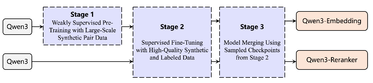 向量模型像是AI的“翻譯器”,它可以將文本、圖片等人類可認(rèn)知的非結(jié)構(gòu)化信息,映射到機(jī)器更易理解的向量空間,再基于這些向量實現(xiàn)高效的信息分類、檢索或排序。也正因此,向量模型對于提升AI的語義理解、信息檢索、多模態(tài)融合等核心能力至關(guān)重要?;谇?模型,通義團(tuán)隊通過對比訓(xùn)練、SFT、模型融合等方法,打造出全新的千問3向量模型,包含文本嵌入模型 Qwen3-Embedding以及文本排序模型Qwen3-Reranker。
