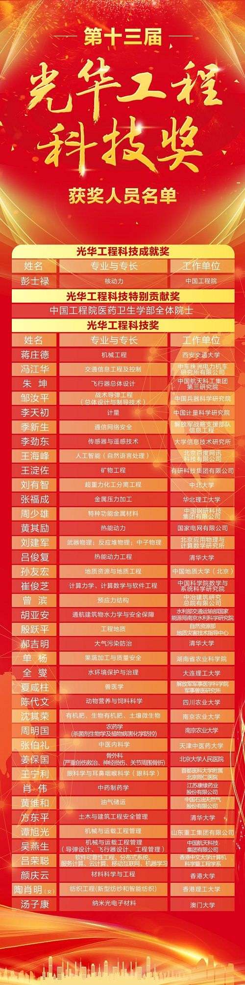 此外,還有機械工程專家蔣莊德、計量專家李天初、人工智能專家王海峰、特種功能金屬材料專家周少雄等不同學(xué)科領(lǐng)域的39位專家獲得光華工程科技獎,這些專家均以非凡的積極性和創(chuàng)造性,在各自領(lǐng)域取得了傲人成績,為我國工程科學(xué)技術(shù)事業(yè)的發(fā)展做出了巨大貢獻(xiàn)。