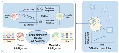 天津大學(xué)與清華大學(xué)的聯(lián)合研究團(tuán)隊(duì)針對這一難題,發(fā)現(xiàn)腦電信號的非平穩(wěn)特性與任務(wù)腦電演變密切相關(guān)?;诖耍麄儎?chuàng)新性地提出了“雙環(huán)路腦機(jī)協(xié)同演進(jìn)框架”,并通過憶阻器神經(jīng)形態(tài)器件加以實(shí)現(xiàn)。在“雙環(huán)路”框架下,腦與機(jī)的學(xué)習(xí)環(huán)路相互協(xié)同,共同促進(jìn)系統(tǒng)性能的提升。
