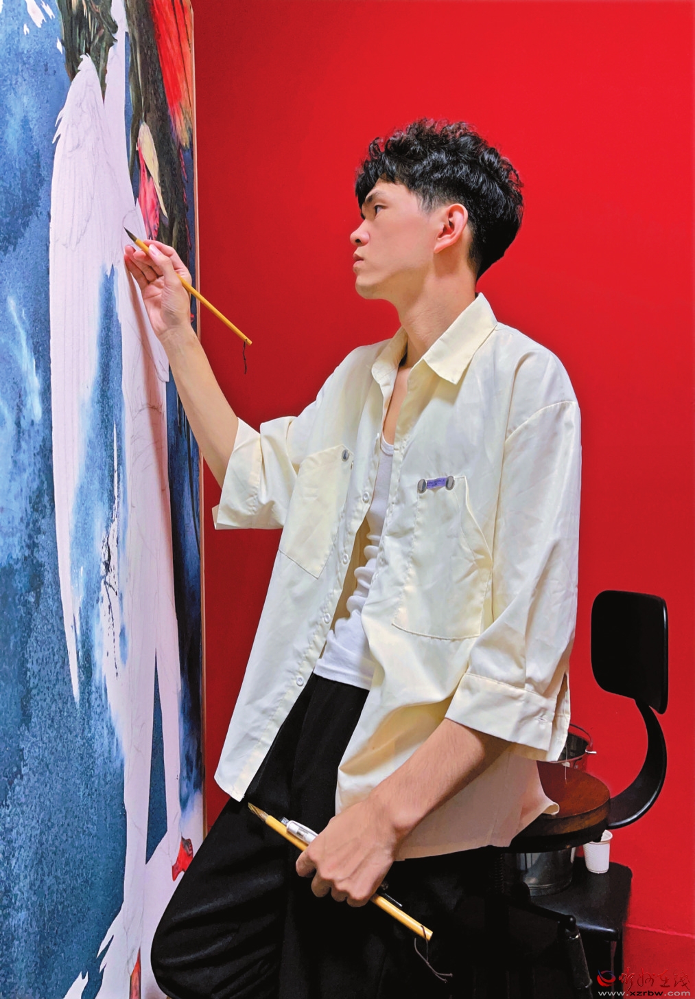 段兵美術(shù)館散發(fā)著青春的氣息,段兵的作品讓小館熠熠生輝。這里的《足記》分外引人注目。2023年6月,歷經(jīng)兩個多月,1000多個小時的繪畫創(chuàng)作,段兵的巨幅水彩創(chuàng)作《足記》誕生了。這幅作品長9米寬2.3米,是2023屆魯迅美術(shù)學院最大的畢業(yè)作品。畫作展現(xiàn)出了超強的繪畫能力與藝術(shù)想象力,作者的情感在創(chuàng)作中匯聚,令人震撼。6月23日,中央電視臺綜藝頻道對段兵進行了采訪。