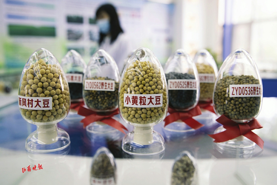 在黑龍江寒地作物種質(zhì)資源庫內(nèi)展出的大豆種子(5月19日攝)。