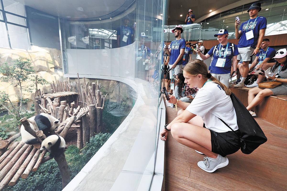 7月31日,大學(xué)生運動員們在成都大熊貓繁育研究基地參觀。中國日報記者 魏曉昊 攝