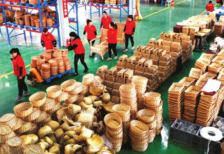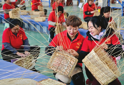 廣靈縣巧娘宮手工編織專業(yè)合作社員工正在整理小籃子成品。
