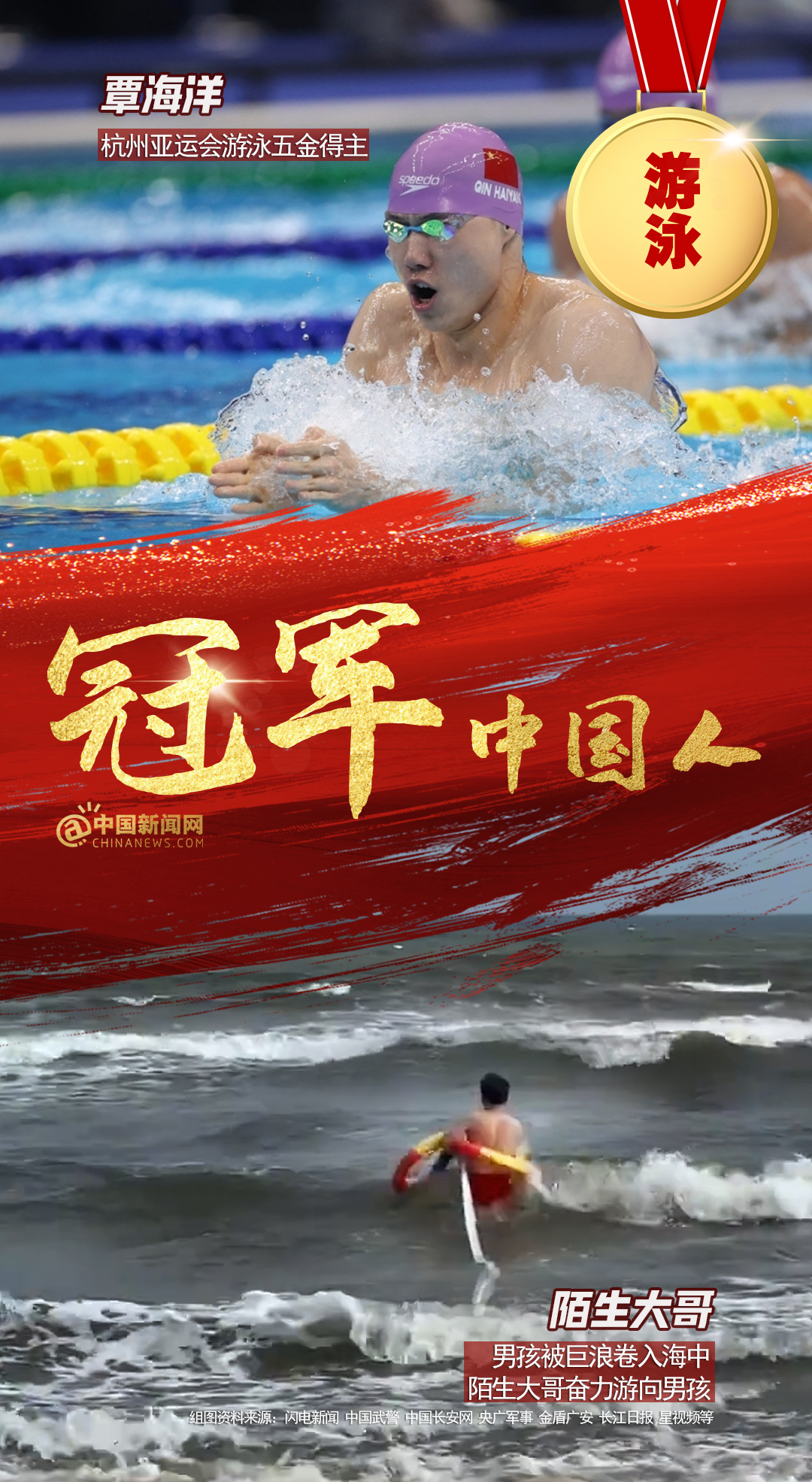中新網(wǎng)12月15日電 全紅嬋、陳芋汐亞運(yùn)雙人10米臺(tái)奪金,彭清林跳十幾米大橋救人;中國(guó)男子4×100亞運(yùn)逆轉(zhuǎn)取勝,仙居人民醫(yī)院醫(yī)護(hù)接力搶救老人…賽場(chǎng)上,人生中,他們都是我們心中的冠軍!2023,冠軍屬于每個(gè)奮力拼搏獲得成績(jī),默默付出與人為善,激勵(lì)、幫助、照亮他人的中國(guó)人!