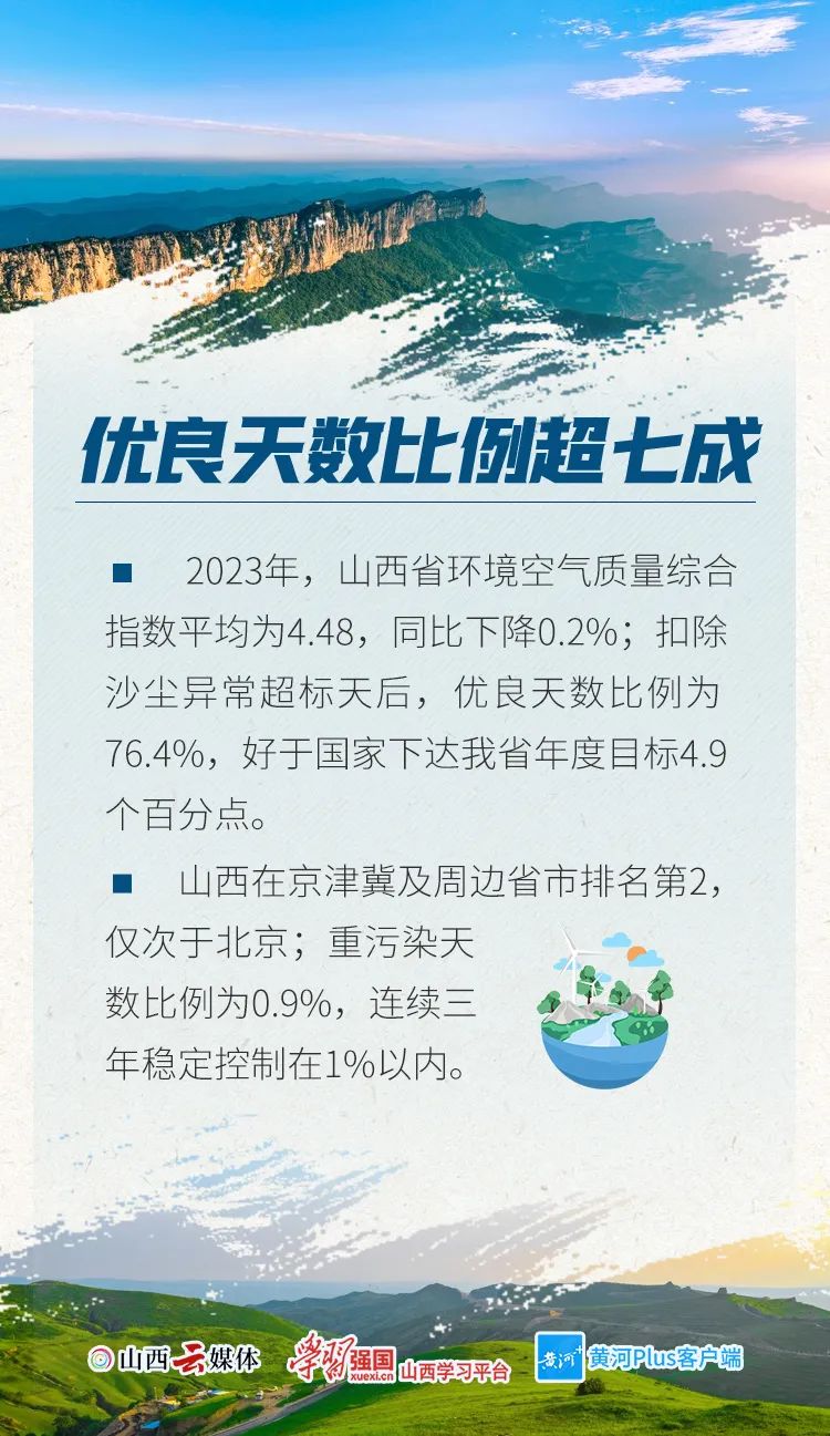 1月29日,山西省生態(tài)環(huán)境廳召開新聞通氣會(huì)。會(huì)議介紹,2023年,全省生態(tài)環(huán)境質(zhì)量明顯改善,國家下達(dá)的約束性指標(biāo)任務(wù)全部完成。山西省連續(xù)兩年在黨中央國務(wù)院污染防治攻堅(jiān)戰(zhàn)成效考核中評為優(yōu)秀。一組數(shù)字,讀懂2023年山西省生態(tài)環(huán)境“成績單”。