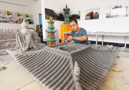 國(guó)家級(jí)非遺項(xiàng)目琉璃燒制技藝傳承人劉開(kāi)寶將客戶訂制的琉璃制品“麒麟獻(xiàn)端”做最后的收尾工作。