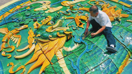 4月22日,國(guó)家級(jí)非遺項(xiàng)目琉璃燒制技藝傳承人劉開(kāi)寶將制作的琉璃制品“麒麟獻(xiàn)端”交付客戶。