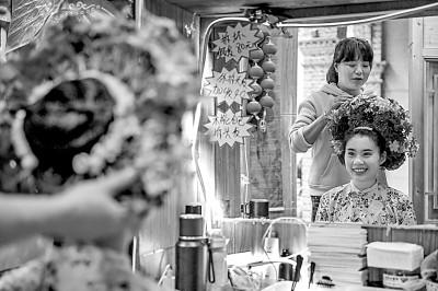 在福建省泉州市中山路的一家蟳埔女簪花圍體驗(yàn)店,老板為游客簪花。新華社發(fā)