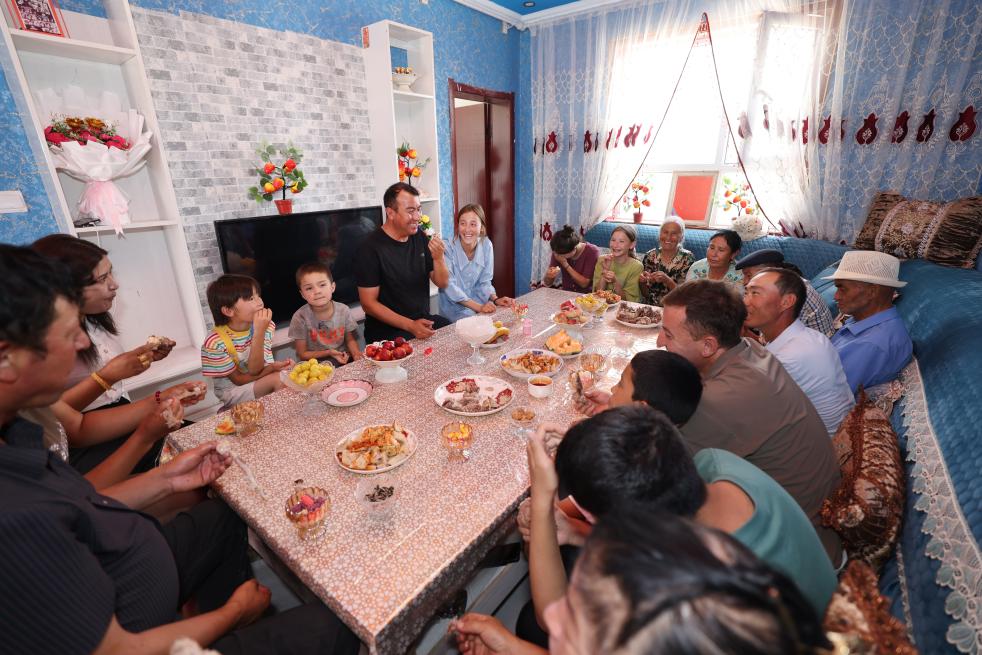 6月30日,烏什縣亞曼蘇柯?tīng)柨俗巫遴l(xiāng)尤喀克亞曼蘇村居民吐?tīng)柡椤ぐI(mǎi)提一家搬進(jìn)新房,親朋好友趕來(lái)慶賀。新華社發(fā)(楊碩 攝)