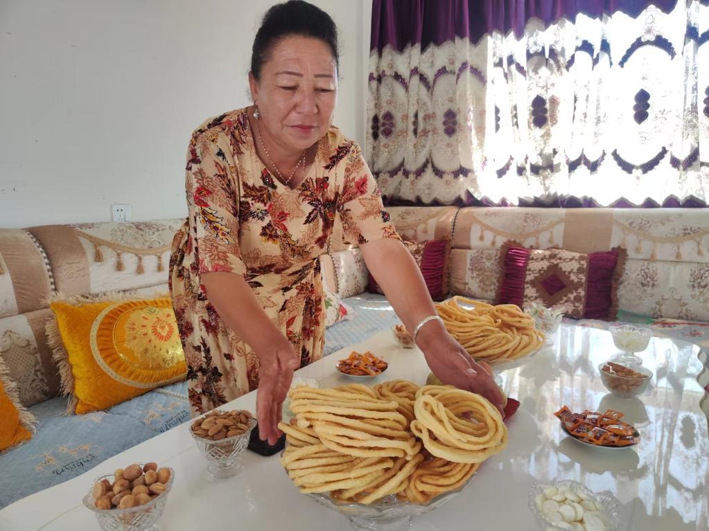 6月30日,烏什縣亞曼蘇柯?tīng)柨俗巫遴l(xiāng)尤勒吐孜布拉克村居民阿曼古麗·熱合曼正在新居里準(zhǔn)備茶點(diǎn)。新華社記者 關(guān)俏俏 攝