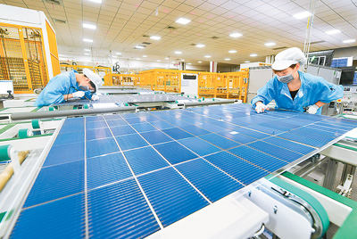 圖為安徽華晟新能源科技股份有限公司的異質(zhì)結(jié)光伏電池及組件工廠(chǎng)內(nèi),技術(shù)人員在對(duì)產(chǎn)品進(jìn)行檢測(cè)。徐 勇攝(新華社發(fā))