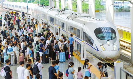 暑運(yùn)期間,鐵路部門在三季度列車運(yùn)行圖的基礎(chǔ)上,編制實(shí)行暑期臨客運(yùn)行圖,全國(guó)鐵路日均安排開行旅客列車11416列,同比增長(zhǎng)9.3%。