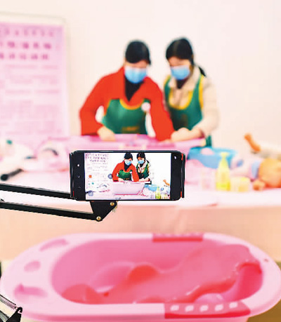 在江西省贛州市會(huì)昌縣人和職業(yè)技術(shù)學(xué)校線(xiàn)上技能培訓(xùn)班,培訓(xùn)師通過(guò)網(wǎng)絡(luò)直播的方式,免費(fèi)向貧困地區(qū)婦女勞動(dòng)力講解母嬰護(hù)理技能。