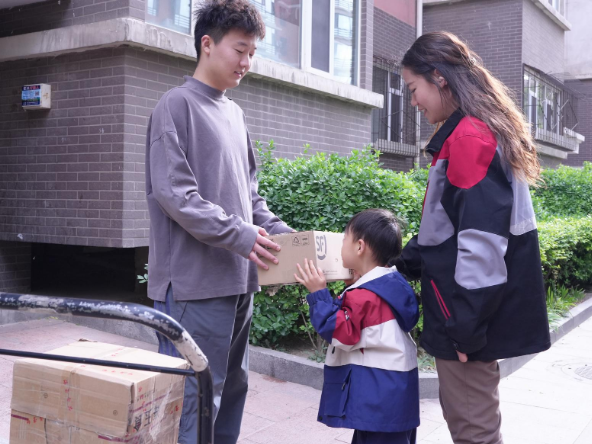 母子倆戴上頭盔,奔赴第一個(gè)派送點(diǎn)。到達(dá)小區(qū)后,面對(duì)要送2件、取1件的任務(wù),辰辰興奮地自告奮勇抱起快遞跑進(jìn)樓道,卻很快被現(xiàn)實(shí)“上了一課”——沒(méi)有電梯,收件人住在5層。當(dāng)他送完這家,額頭滿是汗水,步伐也明顯跟不上媽媽了。出了小區(qū),辰辰一句“真累呀,還有那么多,得送到啥時(shí)候啊”,道出了孩子對(duì)媽媽工作艱辛的初步體會(huì)。而閆詩(shī)琪輕撫兒子頭說(shuō)道,“孩子,干啥工作也要有耐心?!辈粌H是對(duì)兒子的鼓勵(lì),更是她日常工作的真實(shí)寫(xiě)照。