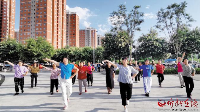 8月10日早上,民心家園小區(qū)居民在比鄰的遺山公園內跳舞、走旗袍秀,展示精神風貌,享受幸福生活。 曹建華 攝