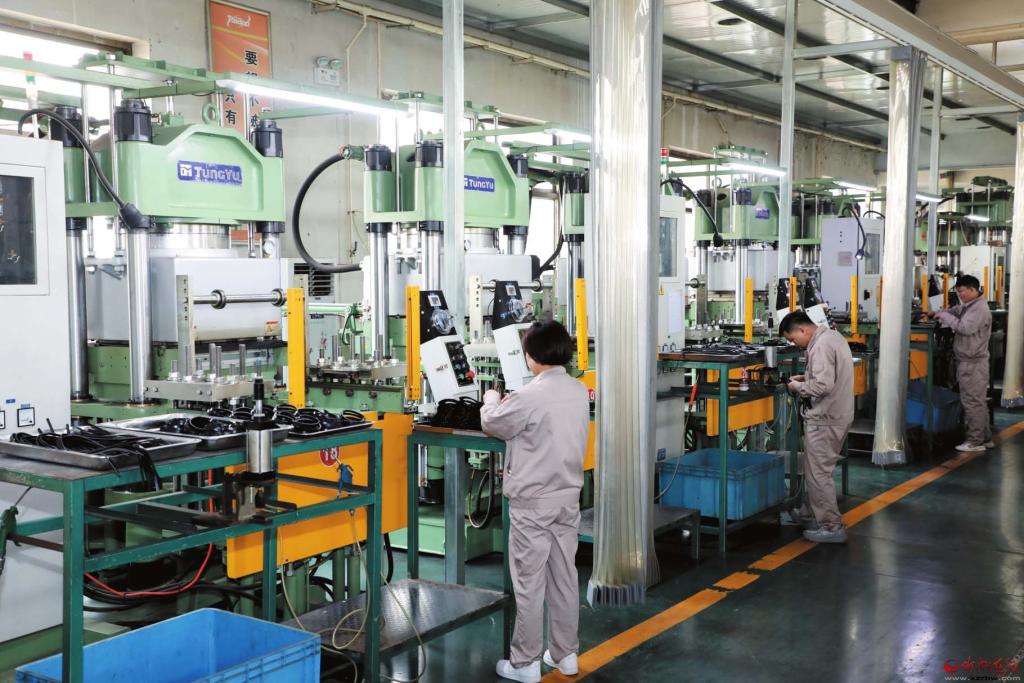 原平市泰寶科技有限公司車間里,工人正在加工橡塑密封件。 褚 震攝