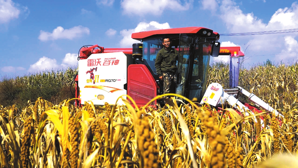 圖為偏關(guān)縣農(nóng)戶收割谷子的場景。