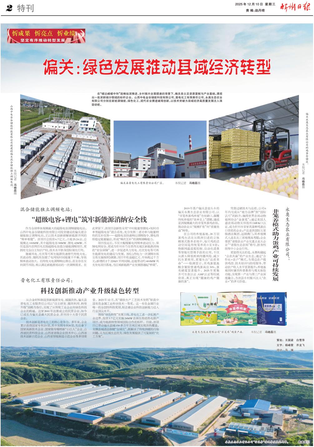 在“碳達(dá)峰碳中和”戰(zhàn)略縱深推進(jìn)、鄉(xiāng)村振興全面提速的背景下,偏關(guān)縣立足資源稟賦與產(chǎn)業(yè)基礎(chǔ),涌現(xiàn)出一批深耕細(xì)分領(lǐng)域的標(biāo)桿企業(yè)。山西中電金谷儲(chǔ)能科技有限公司、晉電化工有限責(zé)任公司、永奧生態(tài)農(nóng)業(yè)有限公司分別在新能源儲(chǔ)能、綠色化工、現(xiàn)代農(nóng)業(yè)賽道破局創(chuàng)新,以技術(shù)突破為縣域經(jīng)濟(jì)高質(zhì)量發(fā)展注入強(qiáng)勁動(dòng)能。