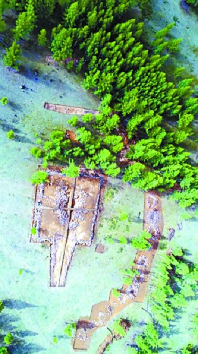 不同的是,匈奴貴族墓頂部有數(shù)米高的石砌方臺,墓道邊緣也有石塊標(biāo)注。每個大墓的一側(cè),還呈弧形分布著數(shù)量不等的陪葬墓,像是一彎月亮。