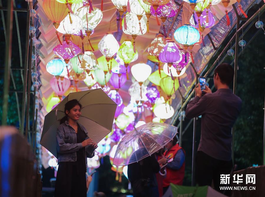 9月29日,游客在龍門(mén)古鎮(zhèn)內(nèi)觀賞廟會(huì)花燈。 新華社記者 徐昱 攝