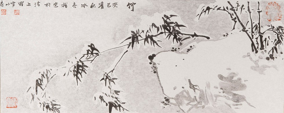 賈冰吾《竹》(指畫)。來自人民網(wǎng)書畫頻道“人民美術(shù)館” 因?yàn)檠o聲無味,在沉沉夜色里,雪的形象難以捕捉,因此詠雪詩中寫夜雪的并不多。白居易的《夜雪》卻能不落正面描寫的窠臼,“已訝衾枕冷,復(fù)見窗戶明。夜深知雪重,時聞?wù)壑衤??!比姳M用側(cè)面烘托,因衾寒窗明而知有雪、因聞?wù)壑衤暥┲兀瑯銓?shí)自然卻韻味十足。 梅雪相依的景觀常讓風(fēng)雅之士詩興大發(fā)?!盁o梅詩興闌珊了,無雪梅花冷淡休?!眲⒖饲f認(rèn)為,梅上無雪,便少了幾分興致。歐陽修在《蝶戀花·臘雪初銷梅蕊綻》中也寫道:“梅雪相和,喜鵲穿花轉(zhuǎn)?!眲屿o之間,讓人感受到大自然在寒冷雪天仍充滿生機(jī)。