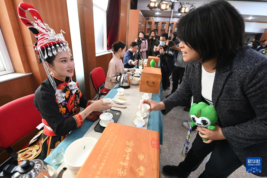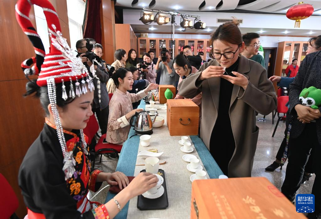 4月25日,媒體記者、與會(huì)嘉賓在茶文化節(jié)新聞發(fā)布會(huì)后品嘗、了解高山白茶。