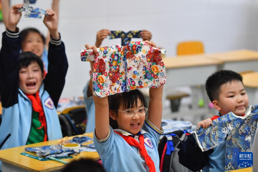 5月15日,在長(zhǎng)沙市天心區(qū)紅衛(wèi)小學(xué),學(xué)生在傳統(tǒng)服飾設(shè)計(jì)課上展示作品。